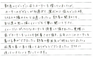 リビングに取り付ける素敵なカーテンをお探しということでご来店いただきました。 お話しを伺うと、他にも色々なお店でカーテンを見て回られているとのことでしたが、上手くイメージが出来ず何が良いのか分からなくなってきたとのこと。 お部屋の雰囲気やテイスト、ご要望(ご主人様のこだわりはファブリックの手触りでした。)など様々な内容をお店でヒアリングさせていただき、カーテンをセレクト。 後日、実際にお部屋に試着して雰囲気を見ていただきます。