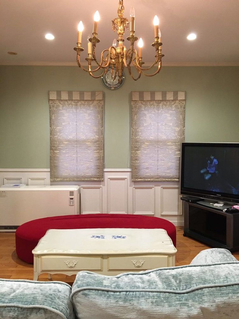 天井や床、備え付けの家具がキレイな木目調のナチュラルなお部屋に、 ダマスク柄のクラシックな輸入カーテンを取り付けました。 ご来店頂いた時は、青が気になっていらっしゃいましたが、訪問の際に色違いもお持ちしたら、 すぐに緑を気に入って下さいまし... -