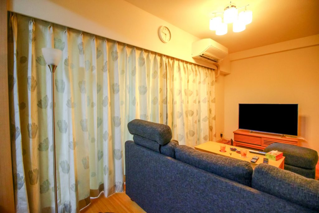 新築マンションのリビングルーム 横幅が4m近くあるリビングの大きな窓にカーテンをかけさせて頂きました。 全体に大きなお花が大胆に描かれたこちらのカーテンをお付しましたが、 ご来店された当初は白〜ベージュ系の無地のカーテンを探していらっしゃいま...