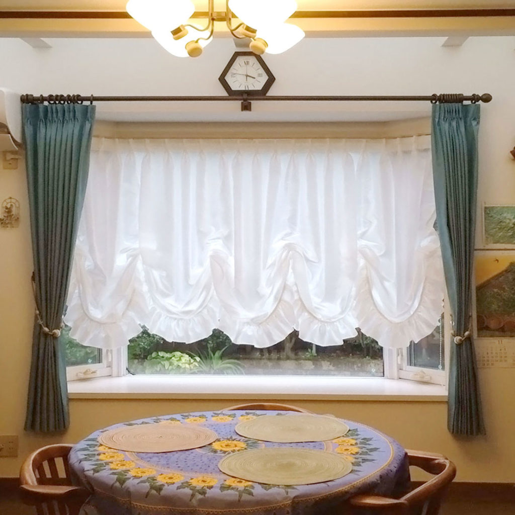 リビングの出窓のカーテンの付け替えでご来店いただきました。 当初はレースのプレーンシェードを付けられていましたが、バルーンシェードに変えたいとのことでした。 外からの視線が気になるとお悩みだったので、バルーンシェードの生地には遮像ボイルを... -