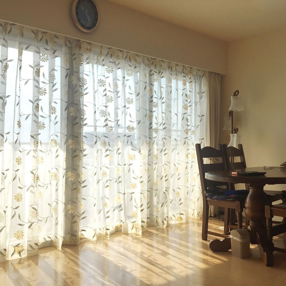 リビングに素敵なレースを、そして、派手すぎない、カーテンが主張し過ぎない、また桜島を隠さないカーテンそんなお部屋にしたいという要望でした。 その中でY様が気に入ったものがこのサンダーソンのレースでした。 オーガンジーに花柄の刺繍が入ったレ... -